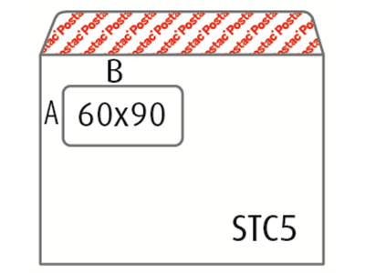 Ikkunallinen tarrakirjekuori irrotettavalla suojateipillä. Kuoren koko C5 229X162 mm. Ikkunan koko: 60X90 mm. Ikkunan sijainti 18 mm vasemmalta ja 15 mm ylhäältä.