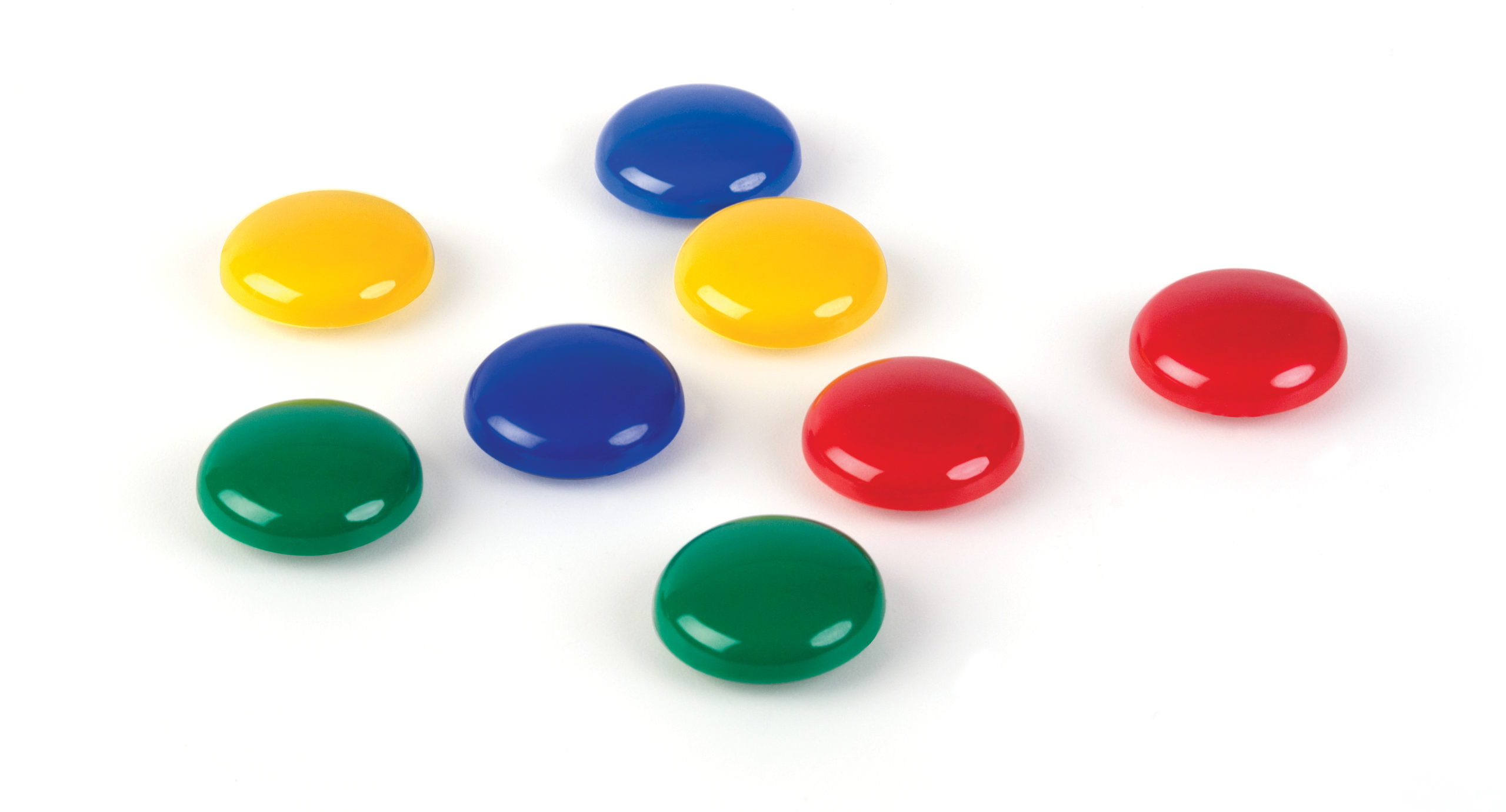 Värilajitelma magneetteja muovisella pinnalla. Värilajitelma, sisältää 2 sinistä, 2 keltaista, 2 punaista ja 2 vihreää magneettia. Yksittäisen magneetin halkaisija on 3 cm.
