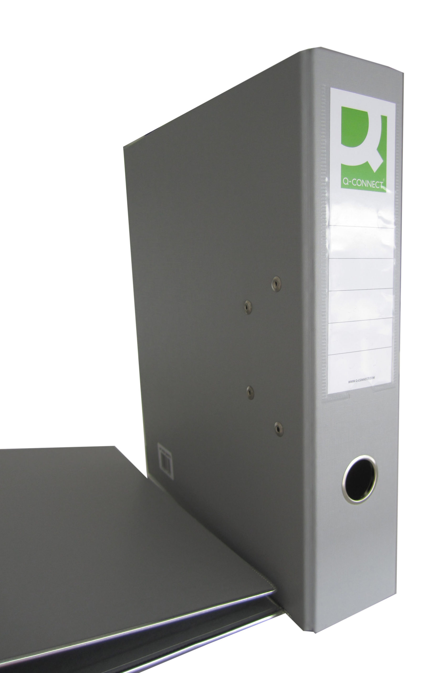 Q-Connect mappi,jonka alareunassa on metallivahvikkeet jotka tekevät mapista tukevamman käyttää. Mapin pinta on polypropeenia ja sisuspahvi kierrätyskartonkia. Selän leveys 7cm ja etikettitaskun koko on 50x158mm.