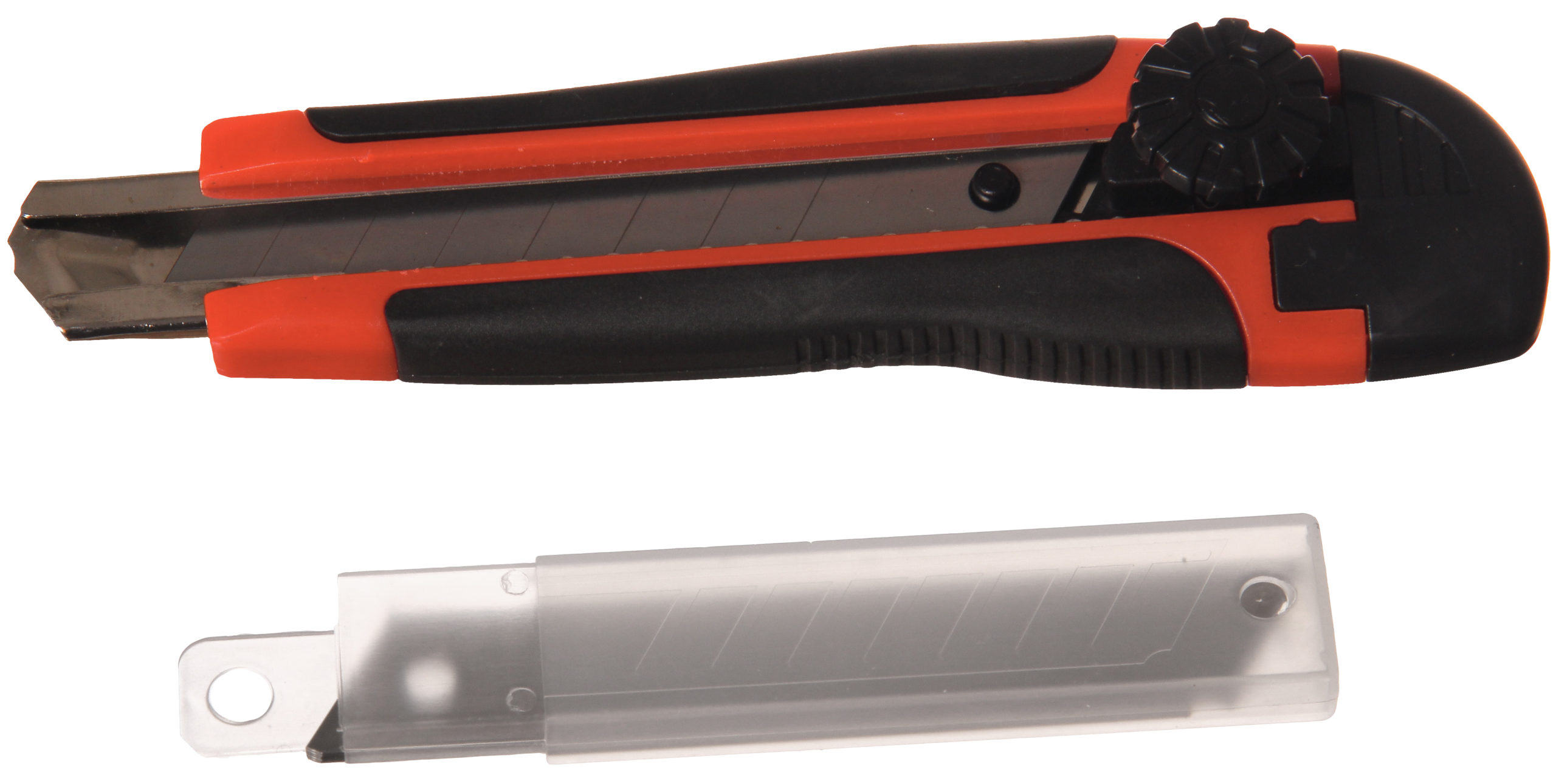 Metallivahvisteinen mattoveitsi 18 mm leveällä terällä. Käyttää standardeja teriä, joissa on 8 osaa. Mattoveitsessä valmiina olevan terän lisäksi mukana tulee 5 varaterää omassa muovikotelossaan.