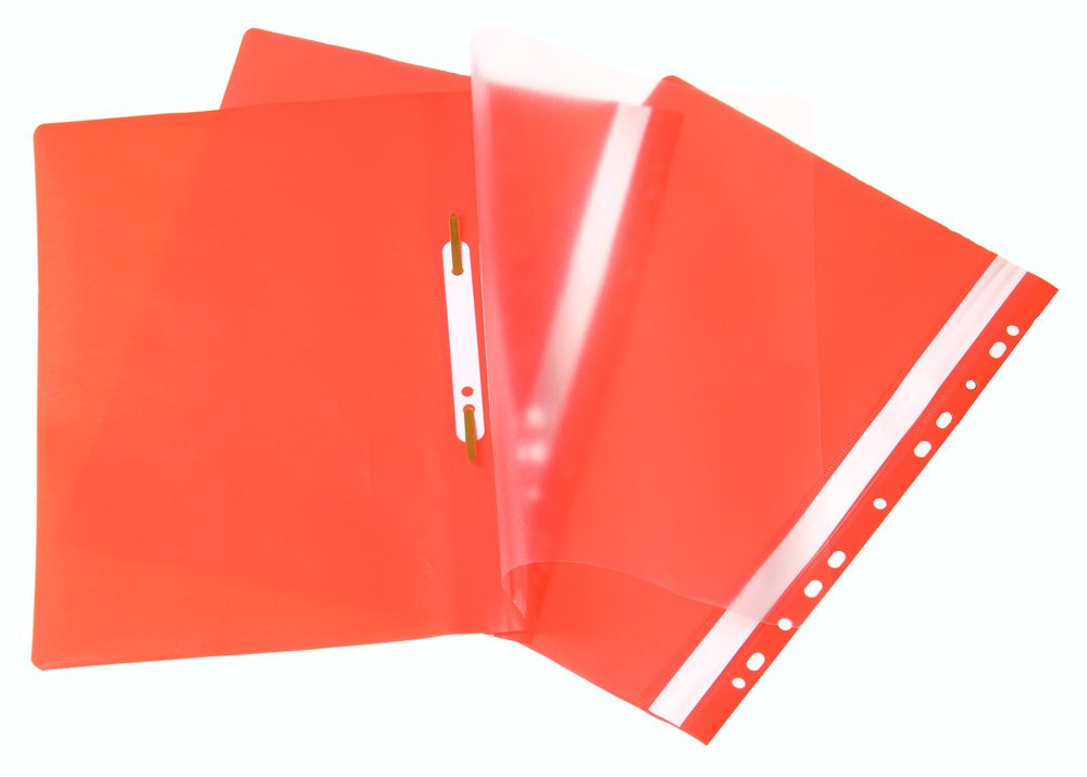Pikanitojakansio A4 kokoinen. Punainen, mutta läpinäkyvä kansi. Etukannen vasemmassa reunassa otsakeliuska.