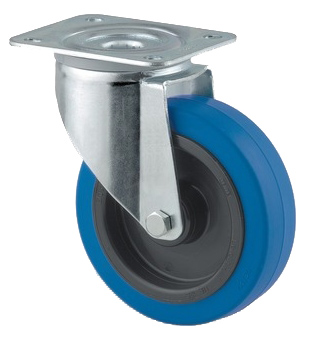 Kääntöpyörä, runko puristettua terästä, sinkitty, kaksoiskuulalaakeroitu kääntöpää, pyörän akseli mutterilla, kääntölaakerin suoja, laippakiinnitys. Pyörän keskiö polyamidia, juoksupinta: elastinen, jälkiä jättämätön, rullalaakerilla. Kantavuus liikkeessä jopa 160 kg. Staattinen kuormitus saa olla jopa 320 kg. Sininen elastinen pinta ei värjää lattiaa pitkässä seisonnassa (toisin kuin esim. normaali musta kumi) Pyörän halkaisija 100 mm.