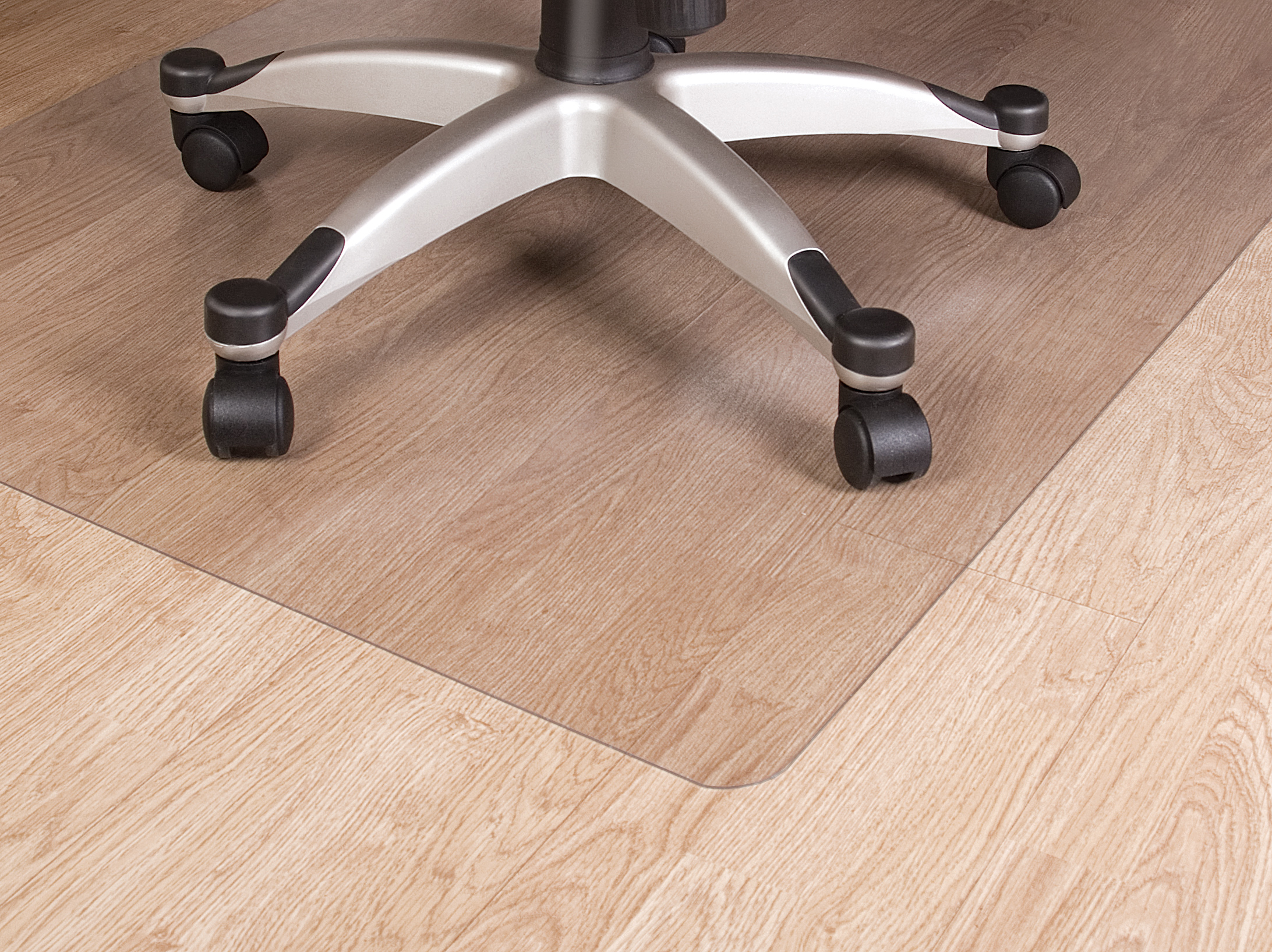 Läpinäkyvä tuolinalusmatto koville pinnoille, esimerkiksi laminaatille tai parketille. Toimistotuolien renkaat kuluttavat nopeasti kokopäiväisessä käytössä – suojaa lattiasi! Valmistettu 1.8 mm polyesteristä. Koko 120 x 150 cm. Reunat on pyöristetty.